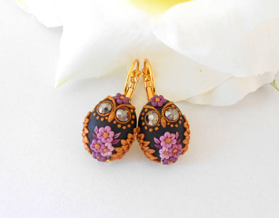 - Owl earrings flower filigree, Gold Purple Black flower earrings, Flower filigree earrings, Polymer embroidery earrings, Gift for her
