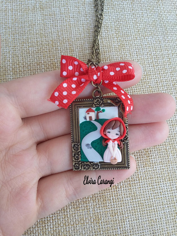 We are following the list of the characters of childhood stories with polymer clay Little Red ideas. Over the hill and through the woods, to grandmothers house we go! Little red riding hood inspired pendants.
